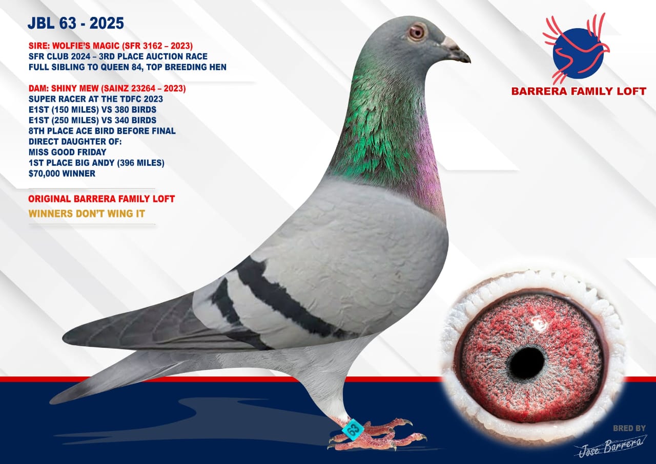Bred from top-performing families with results in One Loft Races and competitive racing.